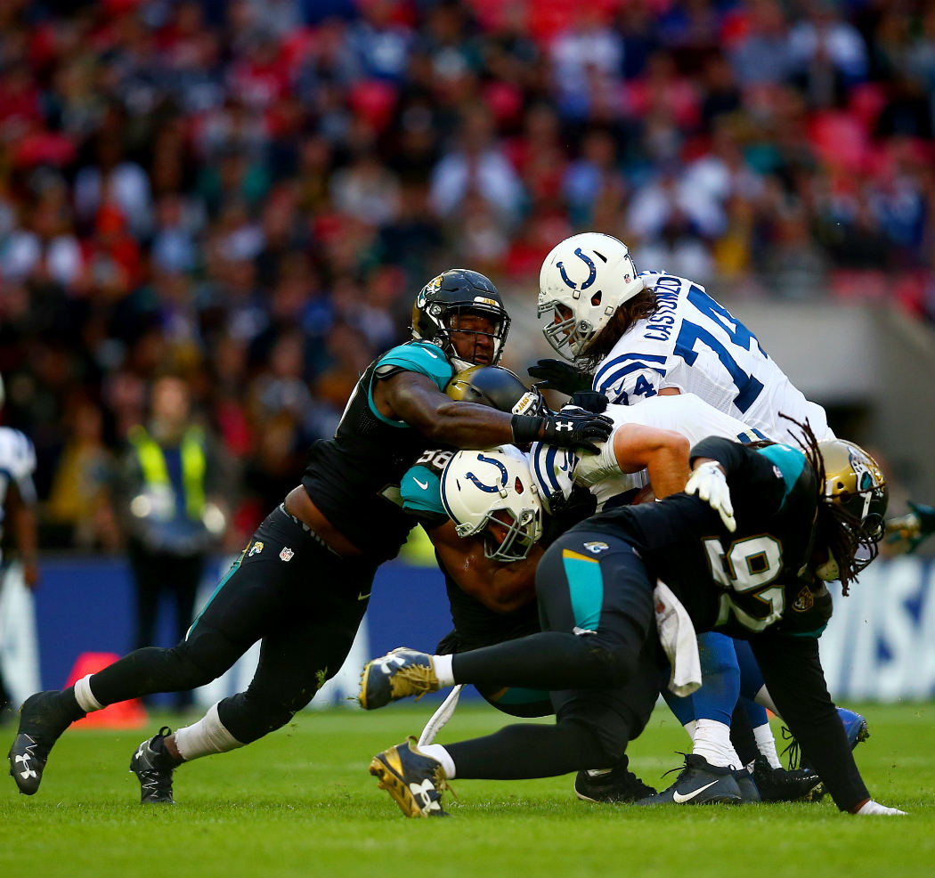 Jacksonville's defense forces Colts QB Andrew Luck into a rough outing in 30-27 victory.